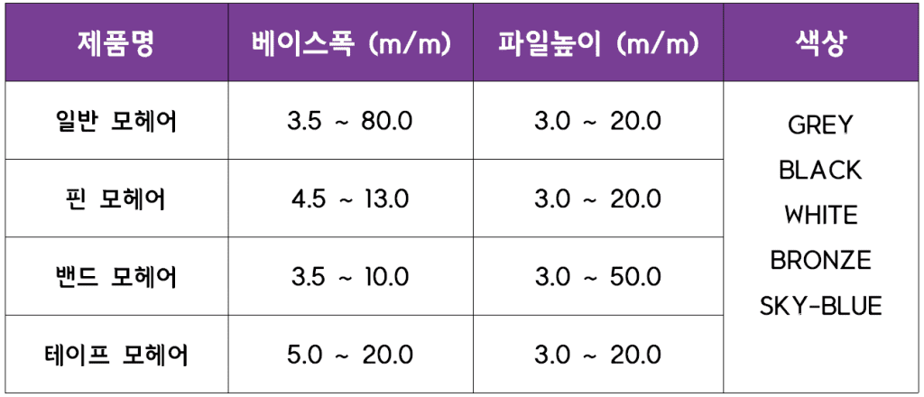 대한민국 원조 모헤어 생산기업100% 국내산 모헤어 제품생산고품질 제품 생산에 최우선고객을 만족시키는 기술기업 일반 모헤어 - Woven Pile Weatherstripping 특장점 유성 일반 모헤어는 각종 창틀의 틈새를 차단하여 단열과 방음 등을 방지하는 문틈막이 재료로써 탁월한 방음 효과를 발휘하여 쾌적한 실내공간을 연출합니다.유성 일반 모헤어의 제 규격은 국내 시판되는 각종 창틀의 규격에 맞추어 다양하게 구비되어 있습니다. 용도 방풍, 방음의 효과가 뛰어난 창호용 기밀재로써 알루미늄 샤시, 플라스틱 샤시, 목재샤시의 미닫이형, 여닫이형, 압축형 등 각종 창틀 및 전자제품, 선박, 전동차등에 사용 가능합니다. 유성 일반 모헤어는 기존 제품의 단점을 완전보완, 각종 창틀의 틈새를 차단하여 공기, 먼지, 벌레의 침투를 방지하여 쾌적한 실내 공간을 연출합니다. 미닫이형 여닫이형 압축형 유성 모헤어 - 시공사례 제품규격 – 홈페이지에 명시되지 않은 규격과 색상은 용도에 맞게 조정 생산 가능하므로 본사로 문의 바랍니다. (문의전화 : 053-632-4873) 제품보기